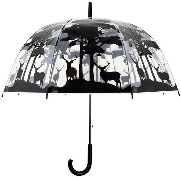 Ez az átlátszó, erdei mintás design esernyő automata nyitással működik. Vázát fekete, műanyag markolat és fémszerkezet alkotja. Minőségi kidolgozásának köszönhetően masszív és időtálló. Az esernyő alatt állva olyan mintha minden oldalról körbevenne minket egy éjjeli erdei táj, szarvasokkal. Egyszerűen bújj be az esernyő alá, és anélkül, hogy felemelnéd, 360 fokban körbe tudsz nézni a fai ágai mögül.