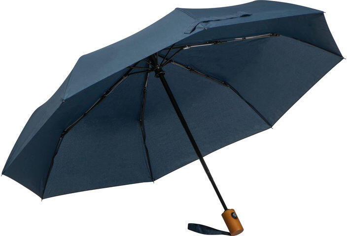 Automata összecsukható esernyő üvegszálas kerettel, újrahasznosított PET palackokból készült huzattal, fa fogantyúval és csuklópánttal.