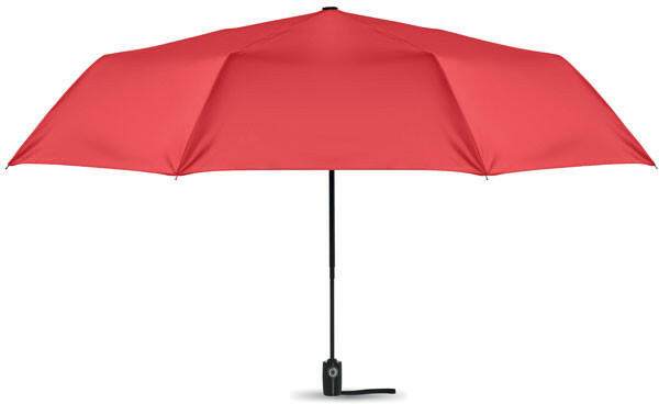 27 colos, 3 szakaszos összecsukható, automatikusan nyíló és záródó, szélálló esernyő. 190T nyersselyem anyagból készült, fekete bevonatos acél szárral. Üvegszálas bordák, fekete PP fogantyú nyomógombbal. Hozzáillő tokban.