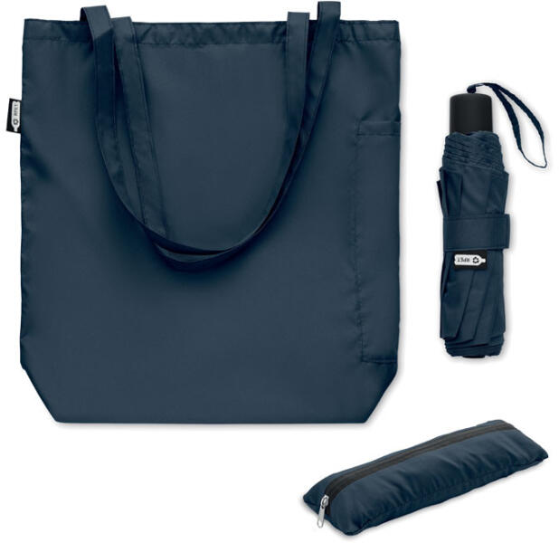 21 colos, egyharmad részre csukható, manuális nyitású és záródású, szélálló esernyő 190T RPET nyersselyem pongee anyagból, bevásárlótáska tokkal. A táska rejtett cipzáras rekesszel rendelkezik, amely az esernyő tárolására szolgál és szárazon tartja a táska tartalmát. Amikor a táska nincs használatban, feltekerhető, és a cipzáras rekesz az esernyő tokjaként működik.