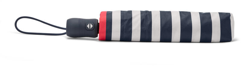 Automata táskaesernyő, csíkos, sötétkék/krémfehér Szín: Sötétkék-krémfehér csíkos Piros szegély Anyag: Ernyő és védőtok: 100% poliészter Rúd: alumínium Fogantyú: műanyag Méretek: Ø: kb. 95 cm Hossza kinyitva: kb. 56,5 cm, összecsukva: kb. 27,5 cm Tartalom: Védőtokkal Gombnyomással kinyitható és összecsukhatóEsernyő táskába illő kompakt méretbenSoft touch markolat rugalmas hordozófüllelVíz- és szennyeződéstaszító felületStabil alumíniumnyélTokkal