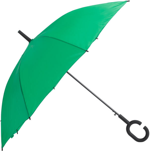 8 paneles, automata szélálló esernyő, a végén gumírozott karpánttal, fém véggel és nyéllel, üvegszálas bordázattal. A végén karra rögzíthető funkcióval. 170T pongee.