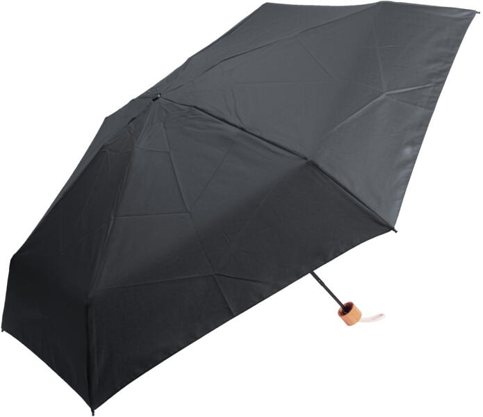 Manuális, szélálló, 3 helyen behajtható RPET mini esernyő 6 panellel, megegyező színű tasakban. Fém kerettel, üvegszálas bordákkal, bambusz fogantyúval és pamut pánttal. 190T RPET pongee. Megkülönböztető RPET címkével.