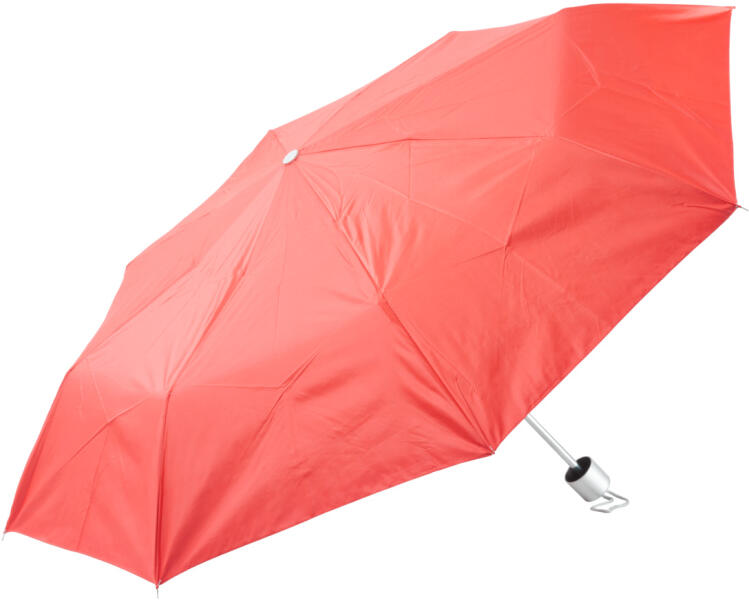 8 paneles, kívül színes, belül ezüst színű, összecsukható, csuklópánttal ellátott, manuális esernyő, fém fogantyúval. 170T poliészter.