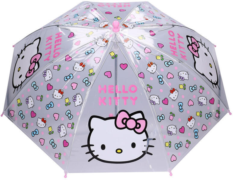 Ezzel a vidám Hello Kitty esernyővel az esőben való séta igazi bulivá válik! Az esernyő rózsaszín és átlátszó csíkokkal van kialakítva, és aranyos Hello Kitty mintával van rajta.